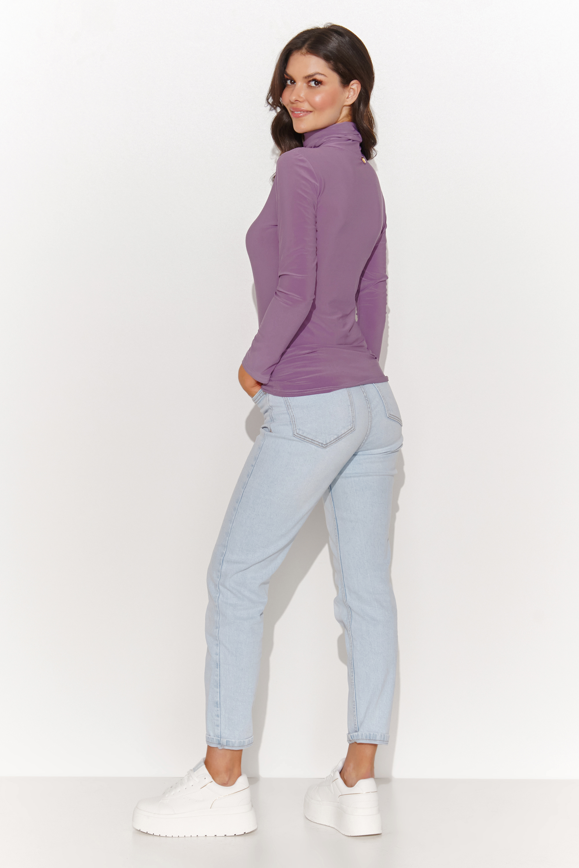 Ta funkcjonalna liliowa bluzka damska wykonana z elastycznej, nieprzezroczystej tkaniny to klasyk wśród bluzek. Jej dekolt w formie praktycznego golfu oraz długi rękaw sprawiają, że otuli Cię w chłodniejsze dni, zapewniając jednocześnie wygodę noszenia. Subtelna pozłacana blaszka umieszczona w górnej części pleców dodaje bluzce nuty elegancji.