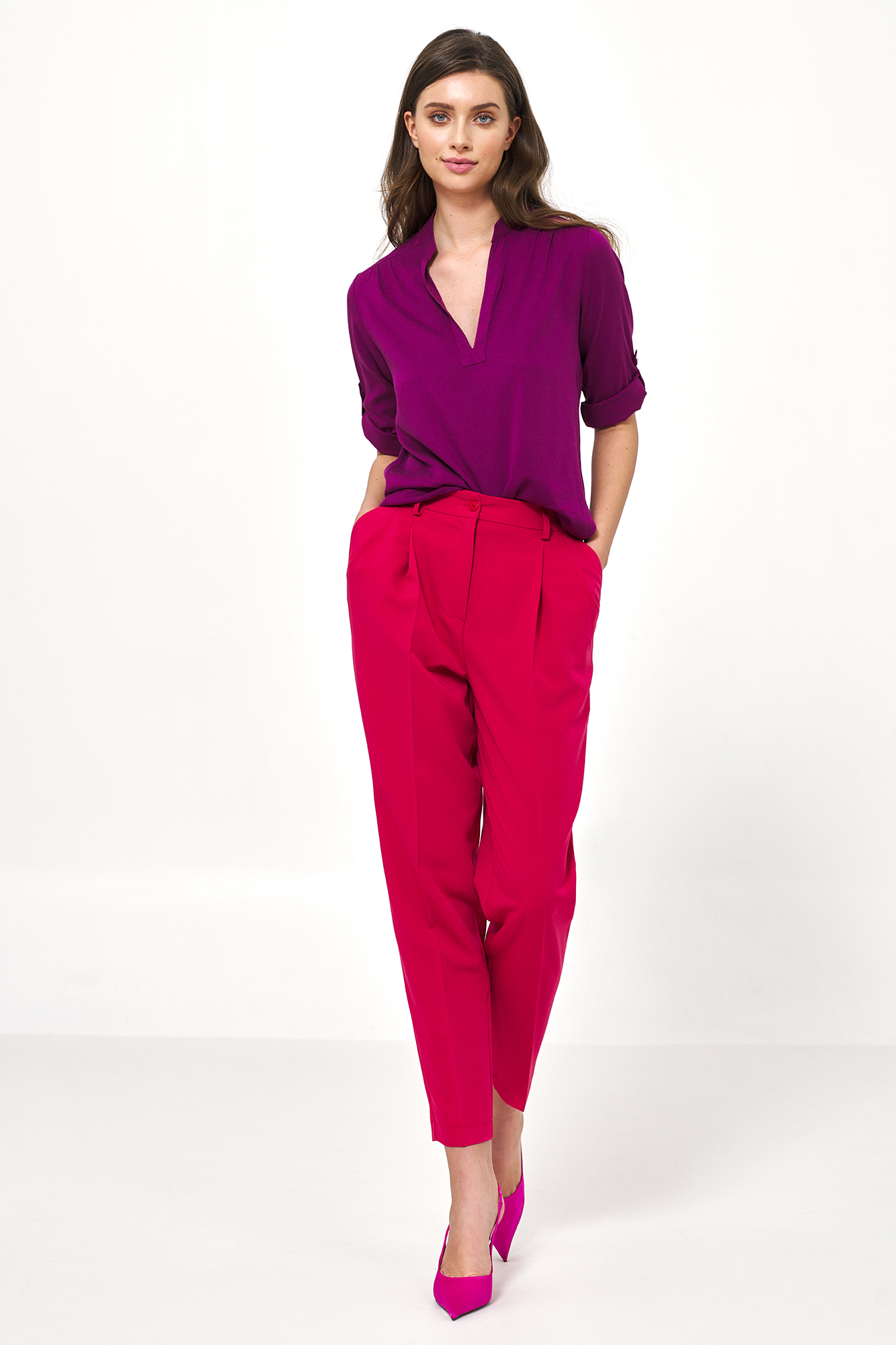 Spodnie 78 typu balloon (różowe) zostały uszyte z lekkiego i przyjemnego materiału z wiskozą, która zapewnia komfort w noszeniu na co dzień. Spodnie posiadają lekko podwyższany stan, który pozwala na doskonałe maskowanie mankamentów figury.