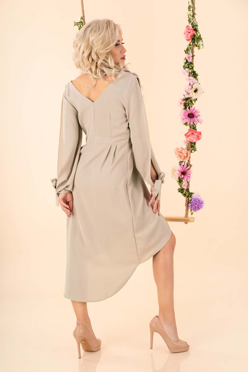 Asymetryczna sukienka z rozciętymi rękawami (beżowa), idealna dla Pań ceniących nieszablonowe rozwiązania w modzie. Dopasowana góra z dekoltem w literę V, zakładki w pasie są tak rozmieszczone, aby wygubić każdą fałdkę, odwrócić uwagę od niedoskonałości, a jednocześnie podkreślić biust oraz wcięcie w talii. Długie rękawy z wiązaniem na końcu mają pęknięcia, kokieteryjnie odsłaniające ramiona. Asymetryczny, zakładany dół jest nieco uwodzicielski i optycznie wydłuża nogi. To doskonały wybór zarówno na przyjęcia z rodziną, jak i uroczyste wyjścia.