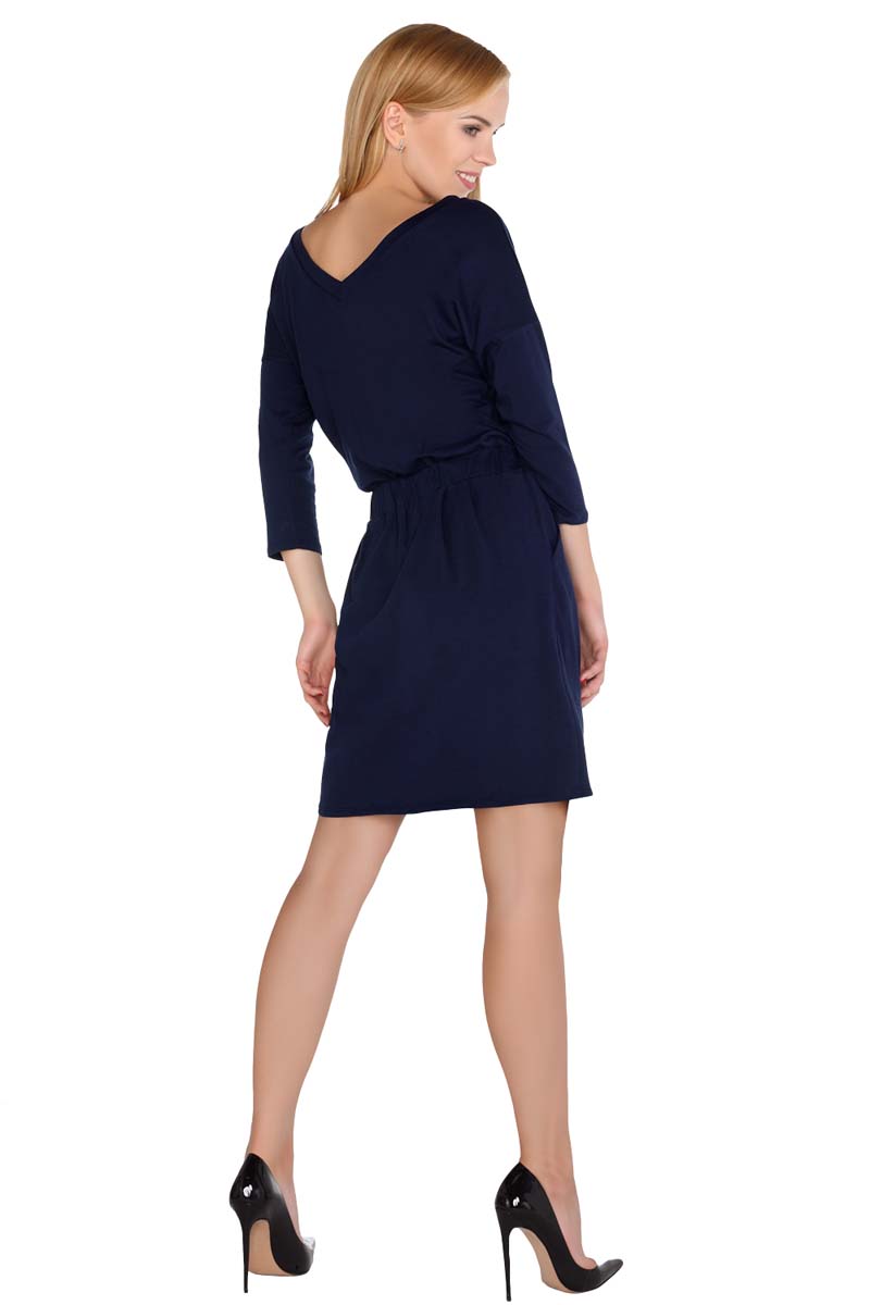Codzienna granatowa sukienka z dzianiny dresowej w sportowym stylu. Prosty krój, idealny dla różnych typów sylwetek. W talii tunel z wiązanymi troczkami umożliwia mocniejsze podkreślenie talii. Dekolt w serek z przodu i na plecach ładnie wydłuża sylwetkę. Sukienka wyposażona w funkcjonalne kieszenie. To propozycja, którą możesz nosić na każdą okoliczność. Klasyczna i uniwersalna. Jej luźny i prosty krój zapewnia poczucie komfortu i wygody przez cały dzień.