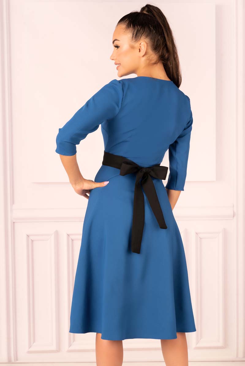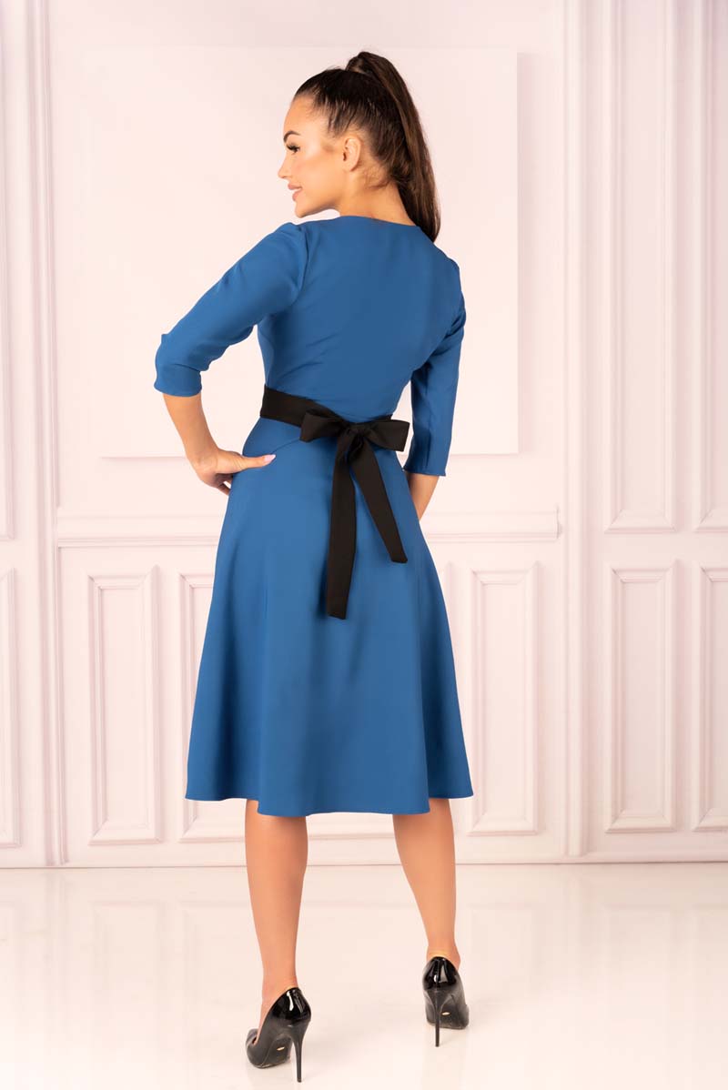Ultra kobieca indygo sukienka z dopasowaną górą i rozkloszowanym, asymetrycznym dołem. Dekolt w literę V eksponuje i wydłuża szyję. Poprzez swoją formę, bardzo dobrze dopasowuje się do sylwetki. Ten niezwykle, elegancki i reprezentacyjny fason z zapięciem na duże guziki doda każdej kobiecie blasku. Dołączona do sukienki czarna szarfa pozwoli zaakcentować talię. Piękna, klasyczna sukienka o długości midi świetnie sprawdzi się, jako stylizacja do pracy i wszelakie wyjścia.