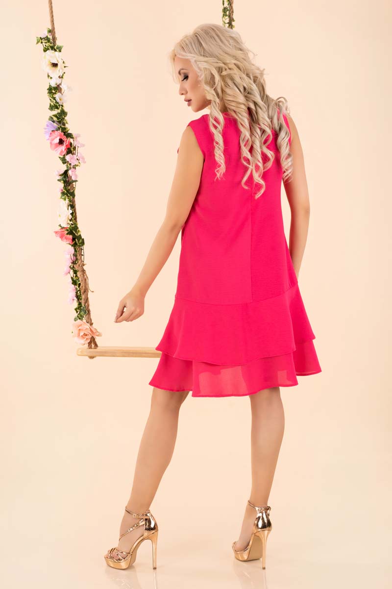 Luźna sukienka bez rękawów z falbankami (fuksja) na dole. Sukienka o długości przed kolano to propozycja dla kobiet ceniących elegancję i wygodę. Falbanki u dołu nadają sukience uroczego i kobiecego charakteru.Trapezowy krój świetnie ukryje szersze biodra i wyszczupli. Długość sukienki nada proporcji i będzie dobrze wyglądać zarówno w połączeniu ze szpilkami, jak i dziewczęcymi balerinkami. Sukienka doskonale sprawdzi się zarówno podczas codziennych wyjść jak i specjalnych okazji.