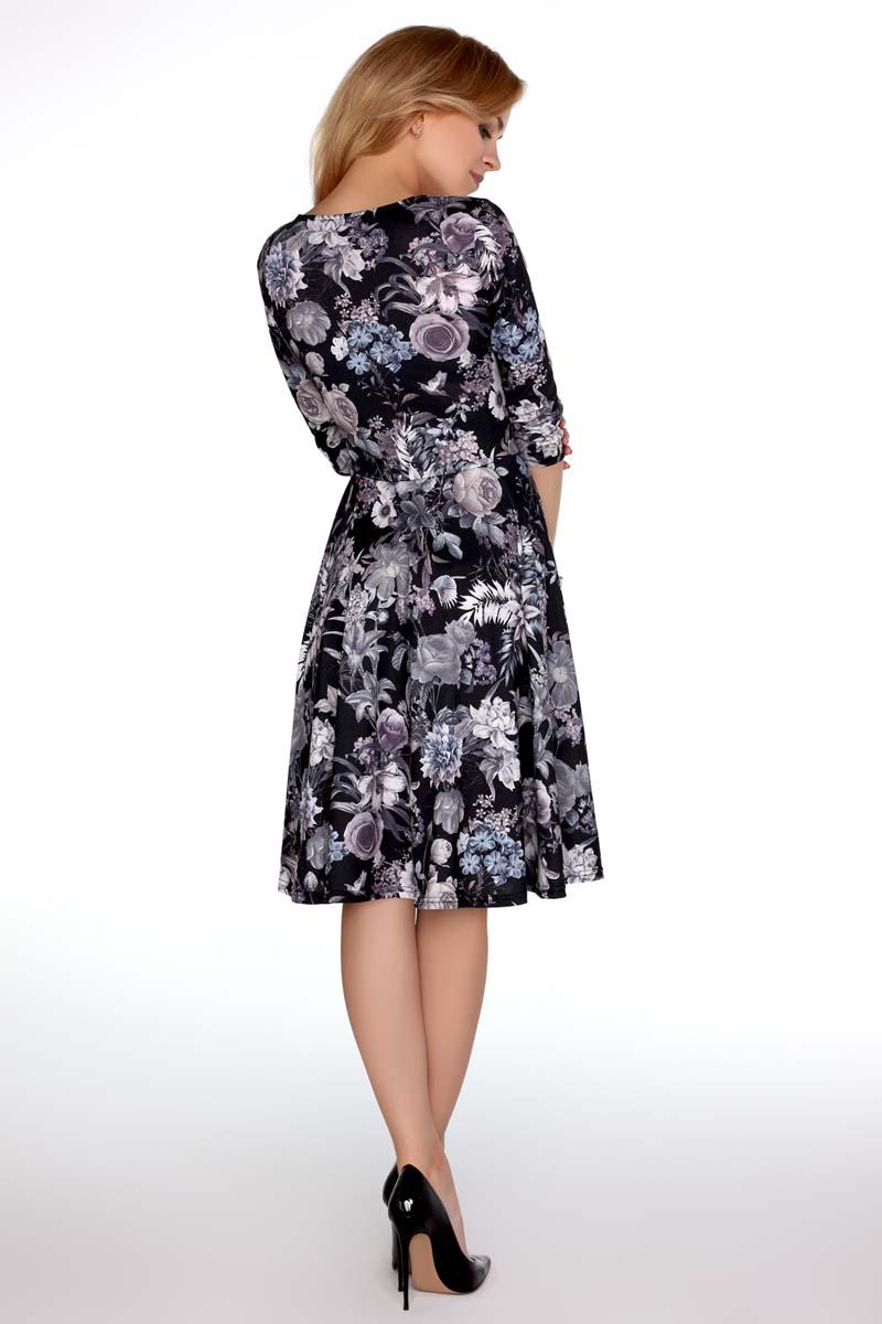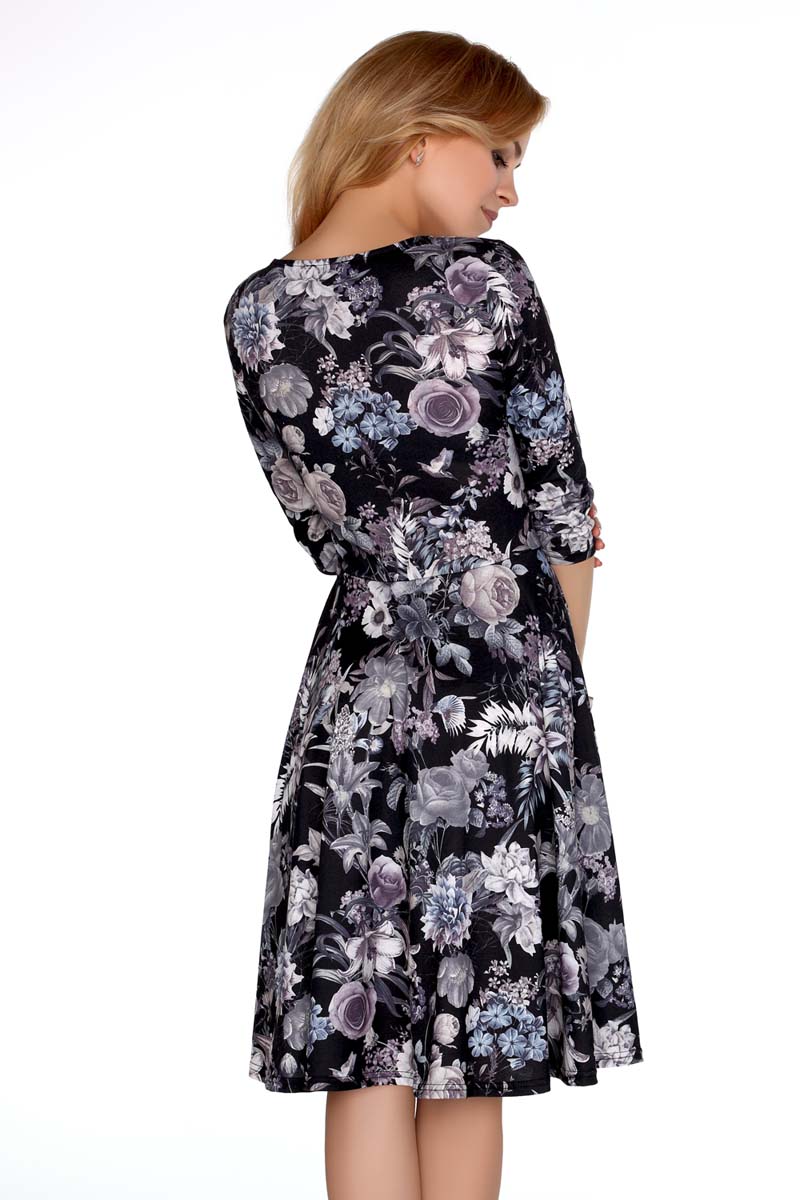 Zwiewna, lekka i subtelna sukienka w kwiaty. Fason z dopasowaną górą i rozkloszowanym dołem. Dekolt w szpic podkreślony kopertowym przełożeniem. Ukośne zaszewki sprawiają, że sukienka pięknie układa się na biuście. Zapinana z boku na kryty suwak błyskawiczny. Model z półdługim, wąskim rękawem. Sukienka o długości midi. Elegancka sukienka z pięknej tkaniny dla lubiących sukienki z szerokim dołem. Sukienka na każdą okazje.